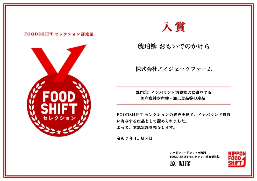 エイジェックファーム(所在地:栃木県小山市)が開発・販売する「琥珀糖おもいでのかけら」が、農林水産省が推進するニッポンフードシフト表彰事業「FOOD SHIFTセレクション(※)」において、全国の選定産品の中から入賞いたしました。